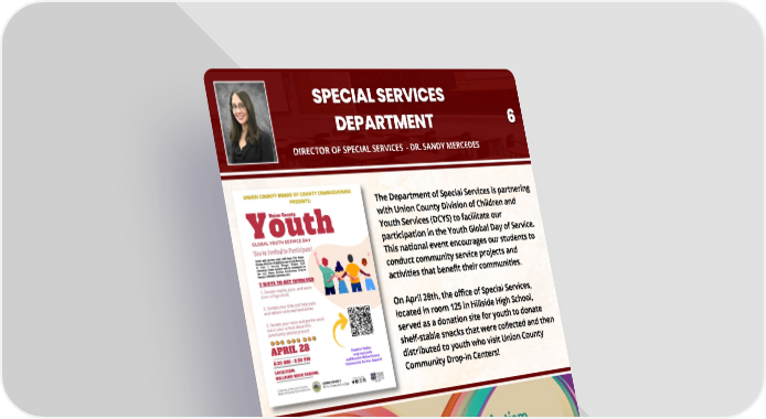 DIRECTOR OF SPECIAL SERVICES - DR. SANDY MERCEDES The Department of Special Services is partnering with Union County Division of Children and Youth Services (DCYS) to facilitate our participation in the Youth Global Day of Service. This national event encourages our students to conduct community service projects and activities that benefit their communities. On April 28th, the office of Special Services, located in room 125 in Hillside High School, served as a donation site for youth to donate shelf-stable snacks that were collected and then distributed to youth who visit Union County Community Drop-In Centers! Click the link below for Information regarding the "Least Restrictive Environment"! This helps people to better understand the law governing special education, and the Individuals with Disabilities Education Act! LEAST RESTRICTIVE ENVIRONMENT PDF