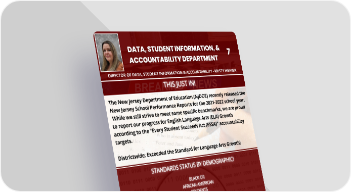 DIRECTOR OF DATA, STUDENT INFORMATION & ACCOUNTABILITY - KRISTY WEAVER The New Jersey Department of Education (NJDOE) recently released the New Jersey School Performance Reports for the 2021-2022 school year. While we still strive to meet some specific benchmarks, we are proud to report our progress for English Language Arts (ELA) Growth according to the "Every Student Succeeds Act (ESSA)" accountability targets. Districtwide: Exceeded the Standard for Language Arts Growth!