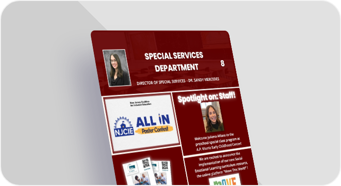 DIRECTOR OF SPECIAL SERVICES - DR. SANDY MERCEDES Welcome Juliana Alfano to the preschool special class program at A.P. Morris Early Childhood Center! We are excited to announce the implementation of our new Social Emotional Learning curriculum resource, the online platform "Move This World" ! SHOUT OUT TO HILLSIDE INNOVATION ACADEMY! THANK YOU FOR SHARING SOME OF YOUR PHOTOS FROM INCLUSIVE SCHOOLS WEEK IN DECEMBER!