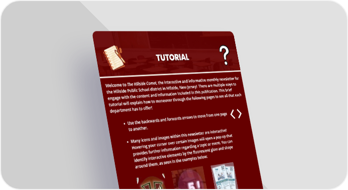 Welcome to The Hillside Comet, the interactive and informative monthly newsletter for the Hillside Public School district in Hillside, New Jersey! There are multiple ways to engage with the content and information included in this publication. This brief tutorial will explain how to maneuver through the following pages to see all that each department has to offer! Use the backwards and forwards arrows to move from one page to another. Many icons and images within this newsletter are interactive! Hovering your cursor over certain images will open a pop-up that provides further information regarding a topic or event. You can identify interactive elements by the fluorescent glow and shape around them, as seen in the examples below: Some photos and elements can be clicked on to take you to different links, pages, or to open videos and additional media. There will be specific text to inform you of what to click, as well as buttons like this: Videos are embedded within the newsletter; you can press play, pause them, as well as turn the sound on or off!