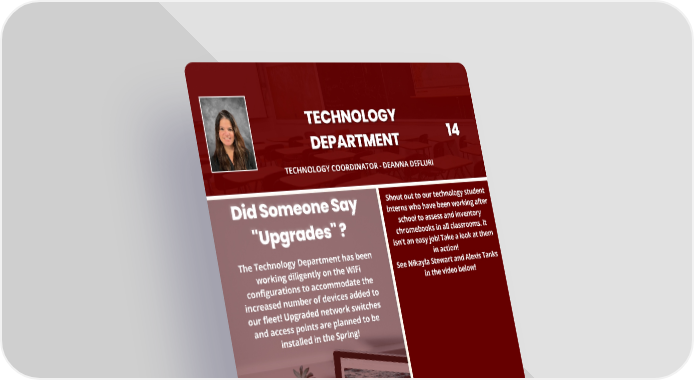TECHNOLOGY COORDINATOR - DEANNA DEFLURI Shout out to our technology student interns who have been working after school to assess and inventory chromebooks in all classrooms. It isn’t an easy job! Take a look at them The Technology Department has been in action! working diligently on the WiFi See Nikayla Stewart and Alexis Tanks configurations to accommodate the in the video below! increased number of devices added to our fleet! Upgraded network switches and access points are planned to be installed in the Spring!