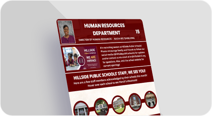 DIRECTOR OF HUMAN RESOURCES - ALICIA WILTSHIRE-KING It's recruiting season at Hillside Public Schools! Please encourage family and friends to follow our social media (@hillsidepublicschools) for updates and/or contact us via email at [email protected] for questions. Also, visit the school website for current openings! Here are a few staff members acknowledged by their schools this month! Hover over each school to see March's shoutouts! March 24th was designated a District "Healthy You-Social Emotional Learning" Day for teachers and students! Feel free to use some of the tips and resources below to help you become more balanced and stress-free!