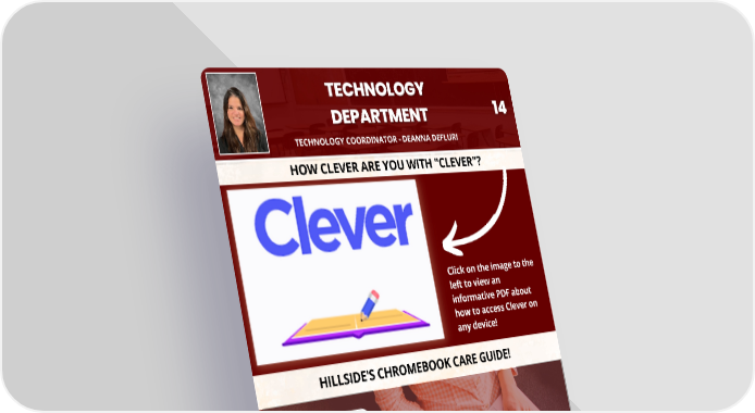 TECHNOLOGY COORDINATOR - DEANNA DEFLURI HOW CLEVER ARE YOU WITH "CLEVER"? Click on the image to the left to view an informative PDF about how to access Clever on any device! HILLSIDE'S CHROMEBOOK CARE GUIDE! DEVICE CLEANLINESS POWER: LCD MONITOR REPORTING PROBLEMS: TRANSPORT: